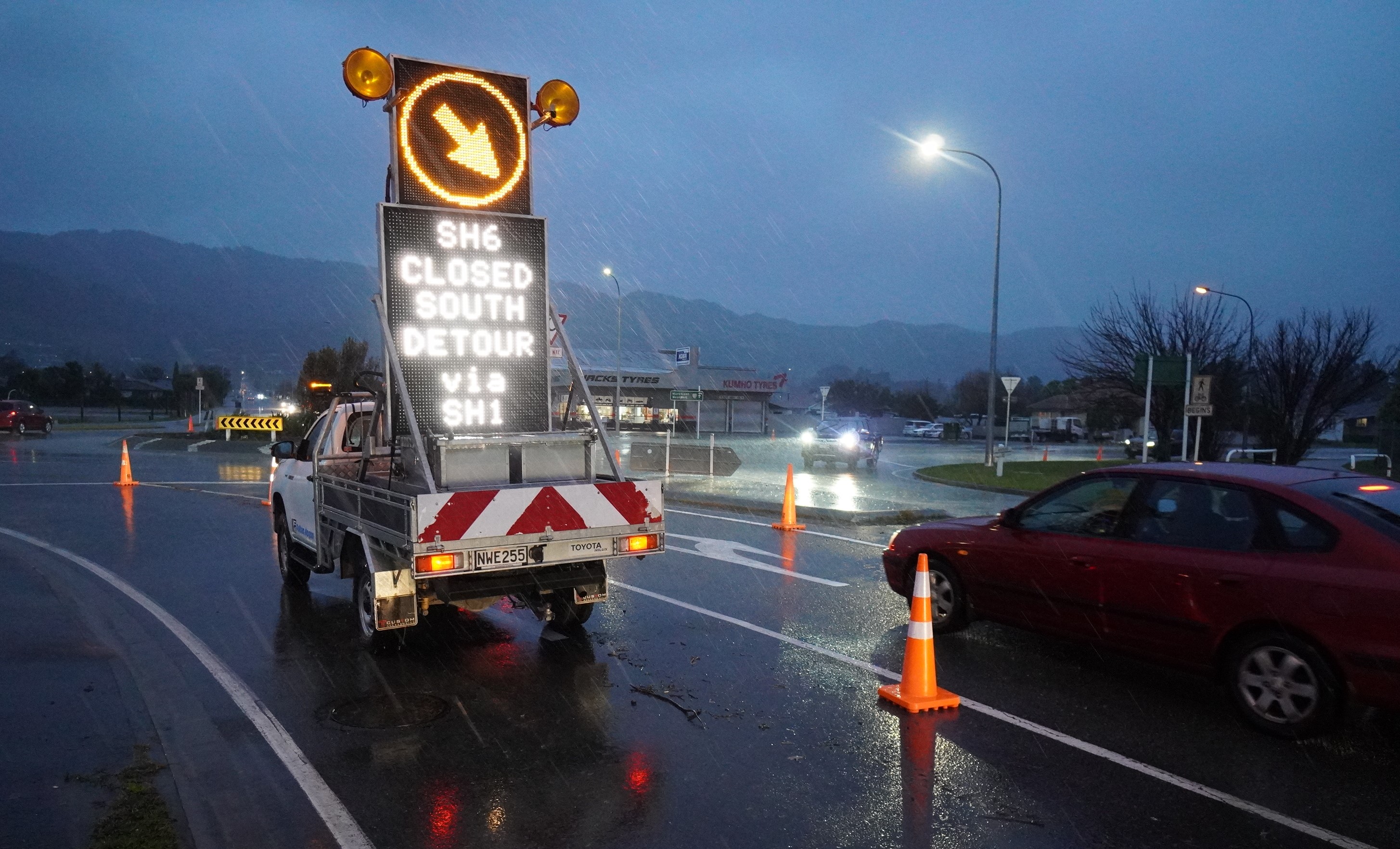 State Highway 6 from Quinney's Bush (near Kohatu) to Belgrove remains closed and is expected to remain so overnight due to fallen trees, flooding, and a slip on Spooners Hill, says NZTA. Contractors are working to clear these.