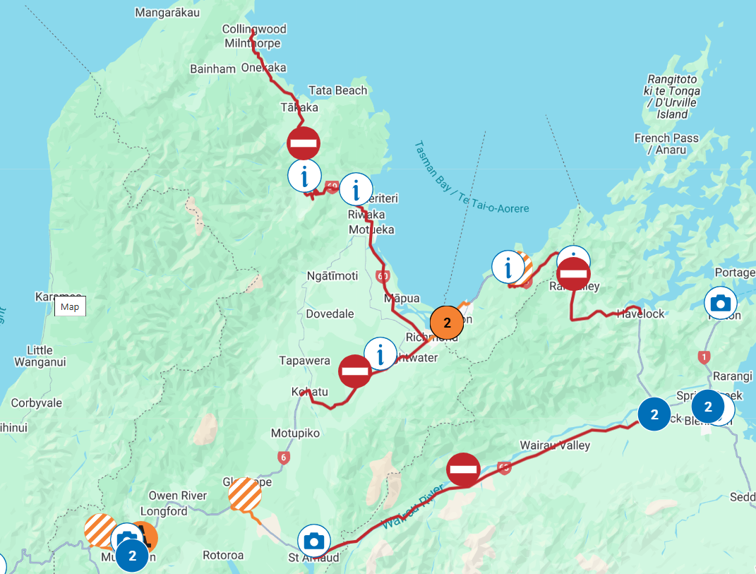 Major roads are closed including State Highway 6 between Hira and Rai Valley; SH60 between Richmond and Collingwood; SH63 between Renwick and St Arnaud; SH6 between Kohatu and Richmond.