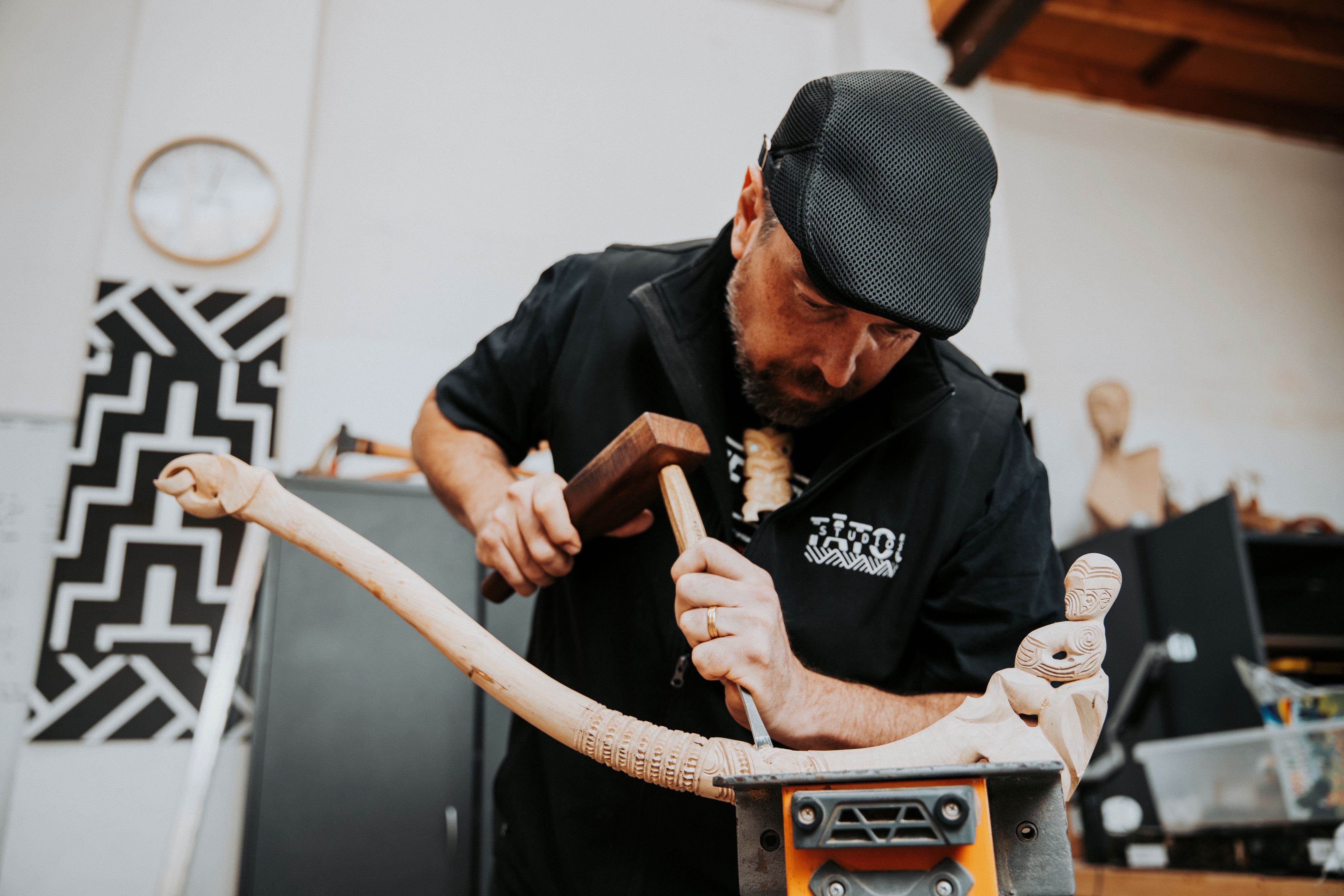 Tātou Studios is a workshop and design studio where traditional craft meets modern application, and where taonga are created to last for generations. Established in June this year, the idea behind it was simple but ambitious; to create a space that builds succession, giving Māori artists real opportunities to develop and produce quality work for the region. Led by project consultant and artist Kahu Paki Paki, the journey has been a challenging one to bring all the components together, he says. “Although we are in our infancy, this concept has been present in the minds of many in the Māori arts community.”